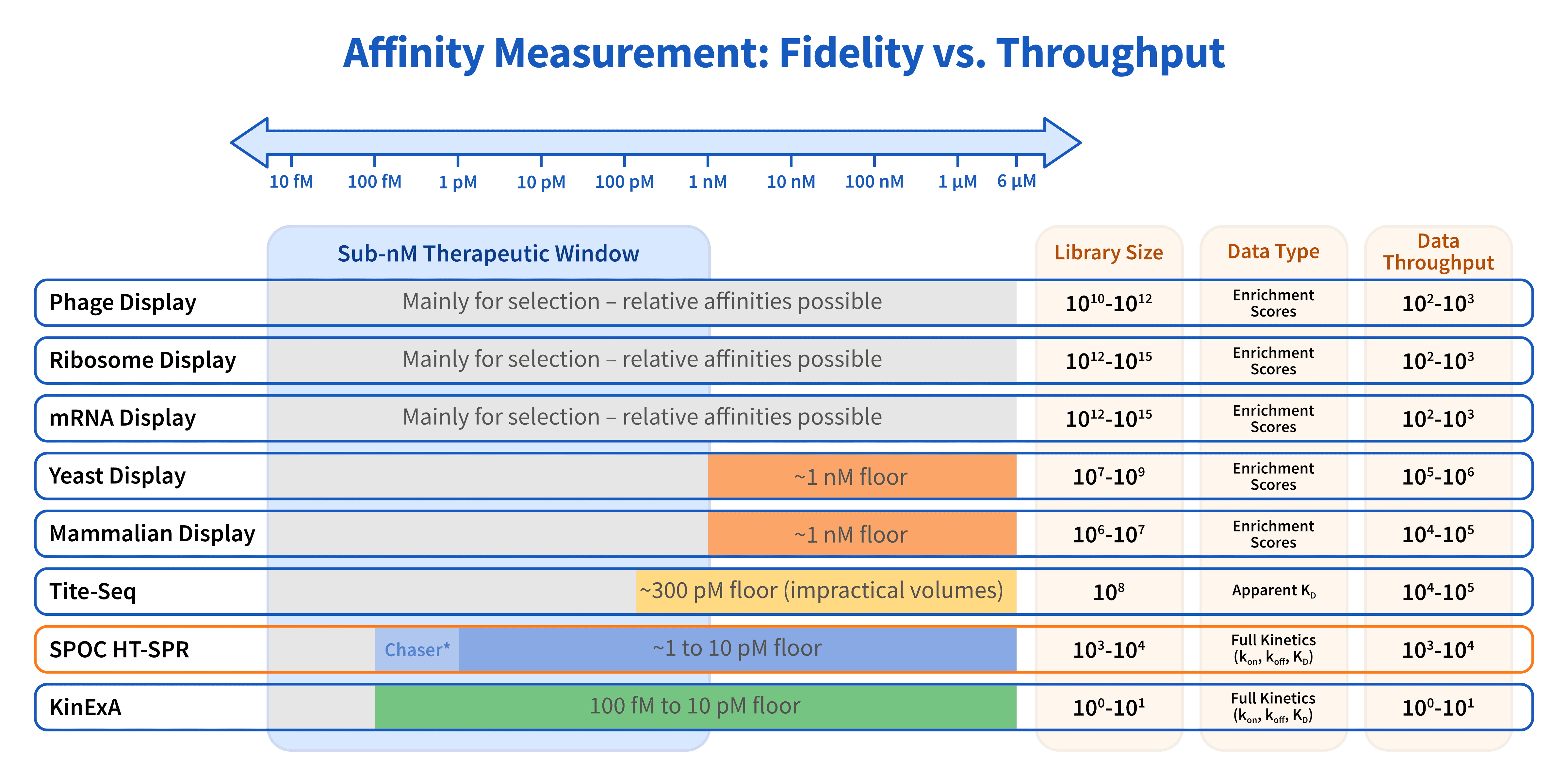 Affinity measurement platforms compared across KD resolution floor, library size, data type, and throughput. Display-based methods (phage, ribosome, mRNA, yeast, mammalian) produce enrichment scores, not quantitative affinities. Tite-Seq returns apparent KD values but saturates below ~300 pM and requires impractical volumes at that limit. SPOC HT-SPR and KinExA resolve into the picomolar range with full kon, koff, and KD per variant. Chaser denotes a solution-phase kinetics extension of SPR in which a competing ligand is introduced after the association phase to measure true solution-phase koff, removing rebinding artifacts inherent to standard surface-based SPR (Quinn, Anal. Chem. 2025).