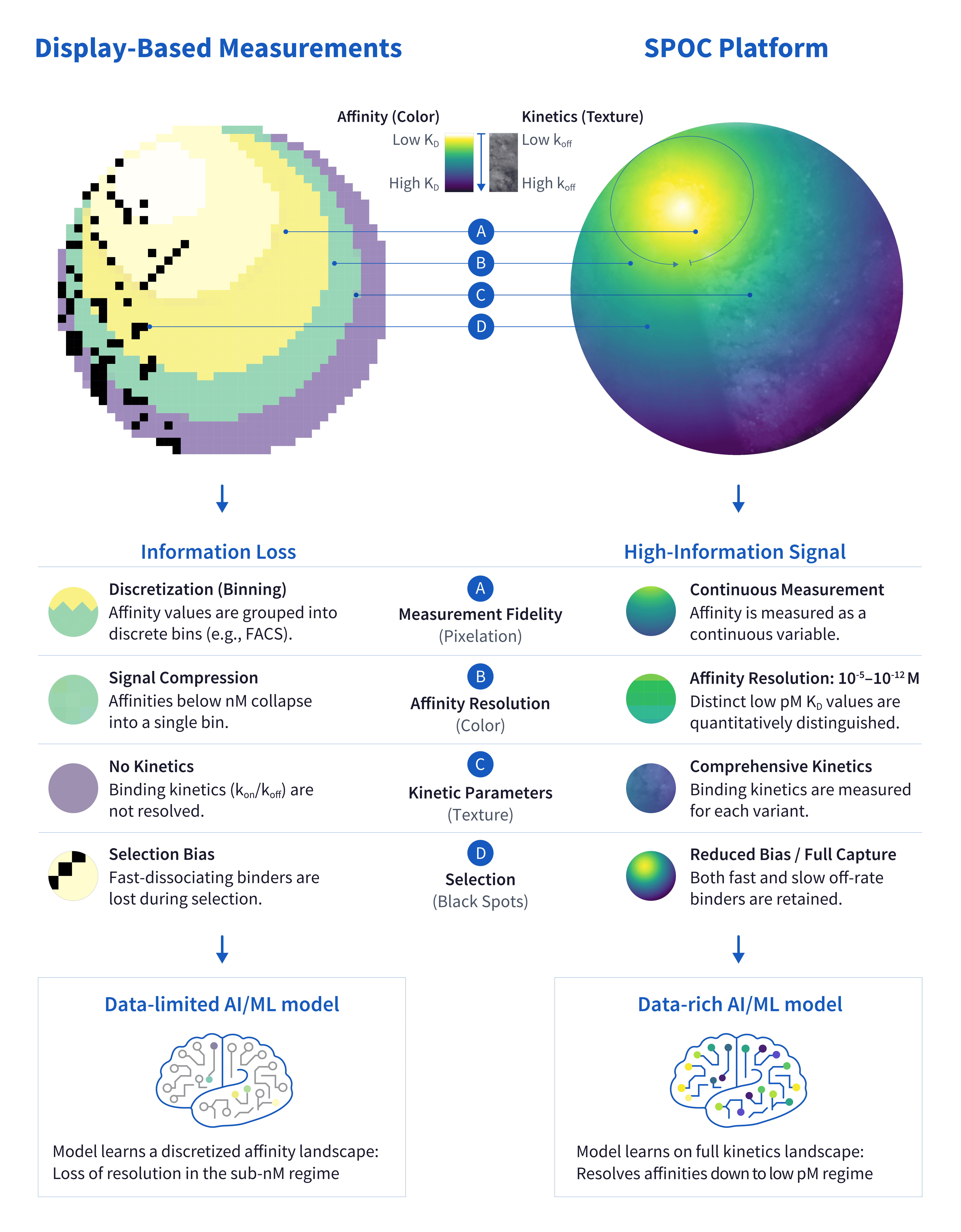 Display-based methods lose information at four levels: fast off-rate binders are depleted during selection (A), continuous affinity values are discretized into FACS bins (B), distinct KD values collapse into the same bin (C), and kinetic differences between variants are never captured (D). SPOC HT-SPR retains both fast and slow off-rate binders, measures affinity as a continuous variable, resolves distinct KD values quantitatively, and returns full kon and koff per variant. The downstream difference is a model trained on a compressed, kinetically filtered approximation of affinity space using display methods versus one trained on the full SPR kinetic landscape.